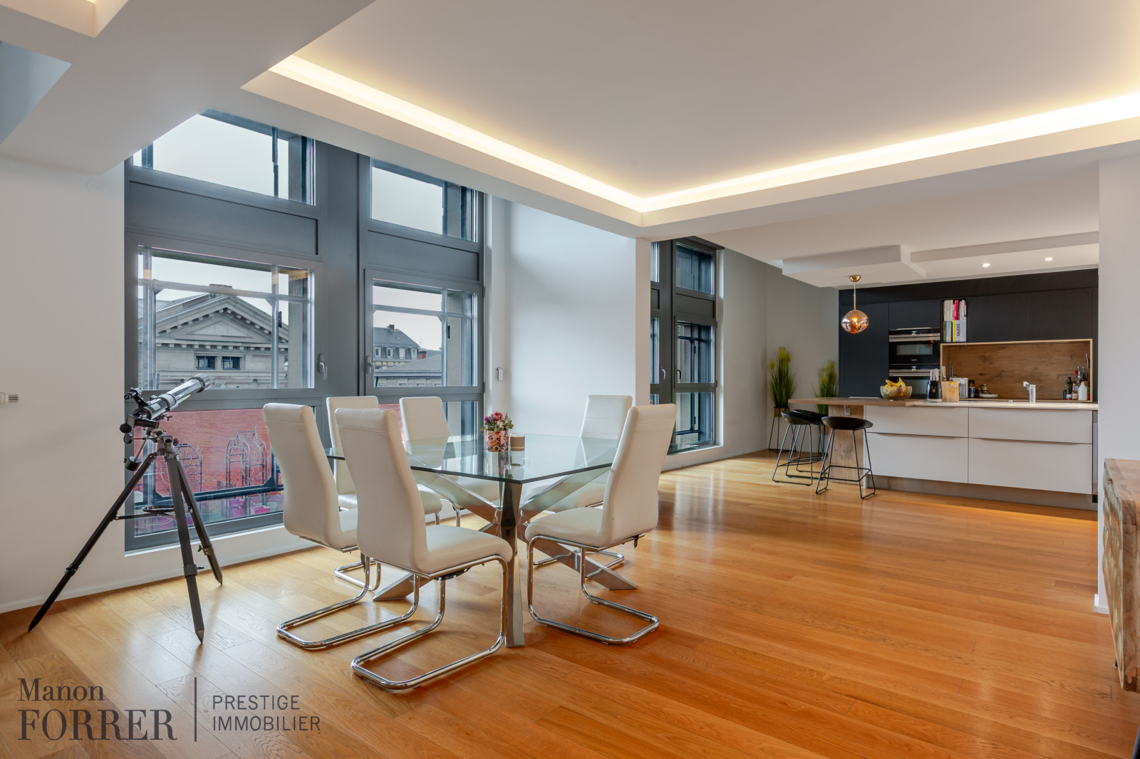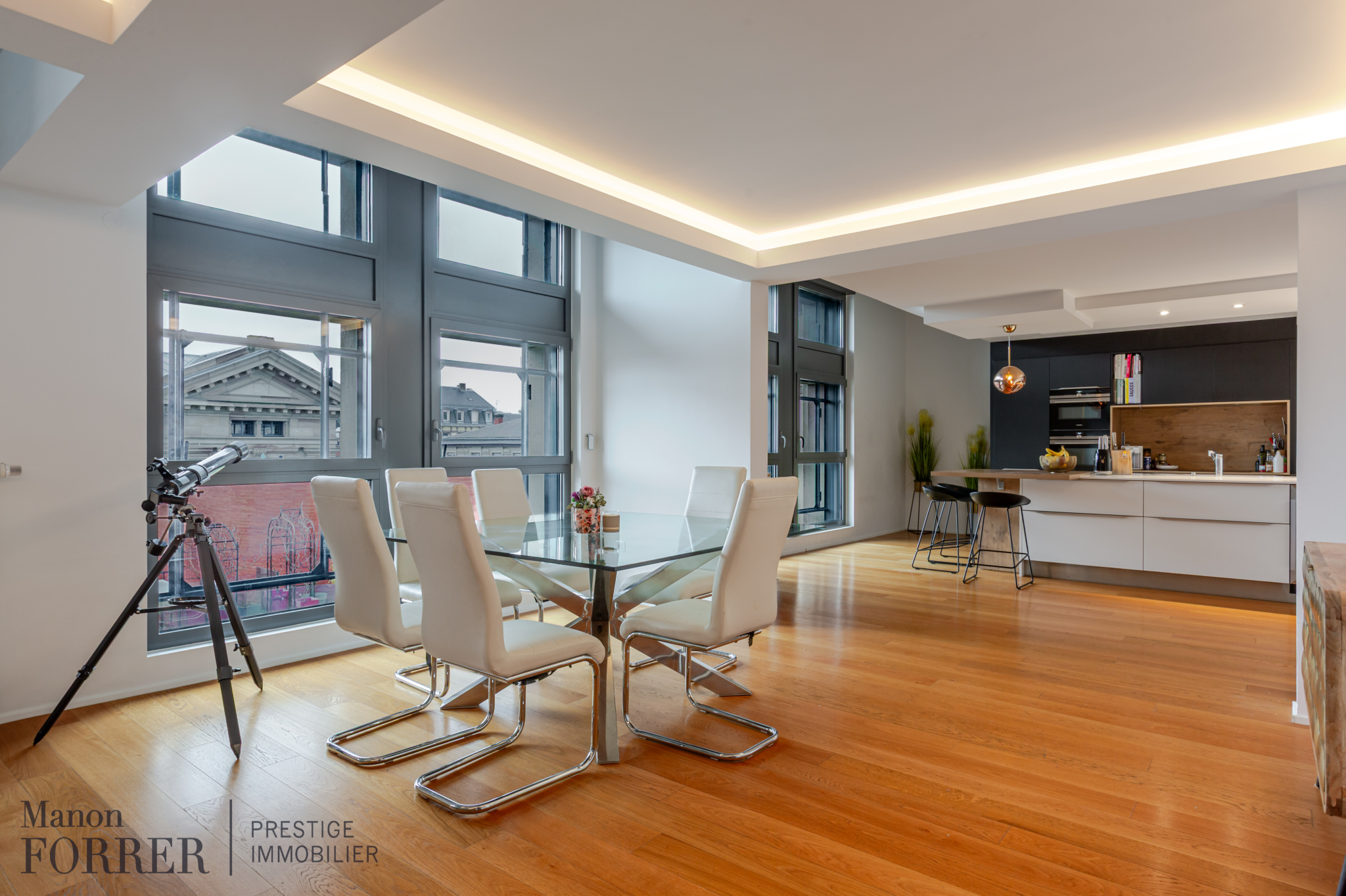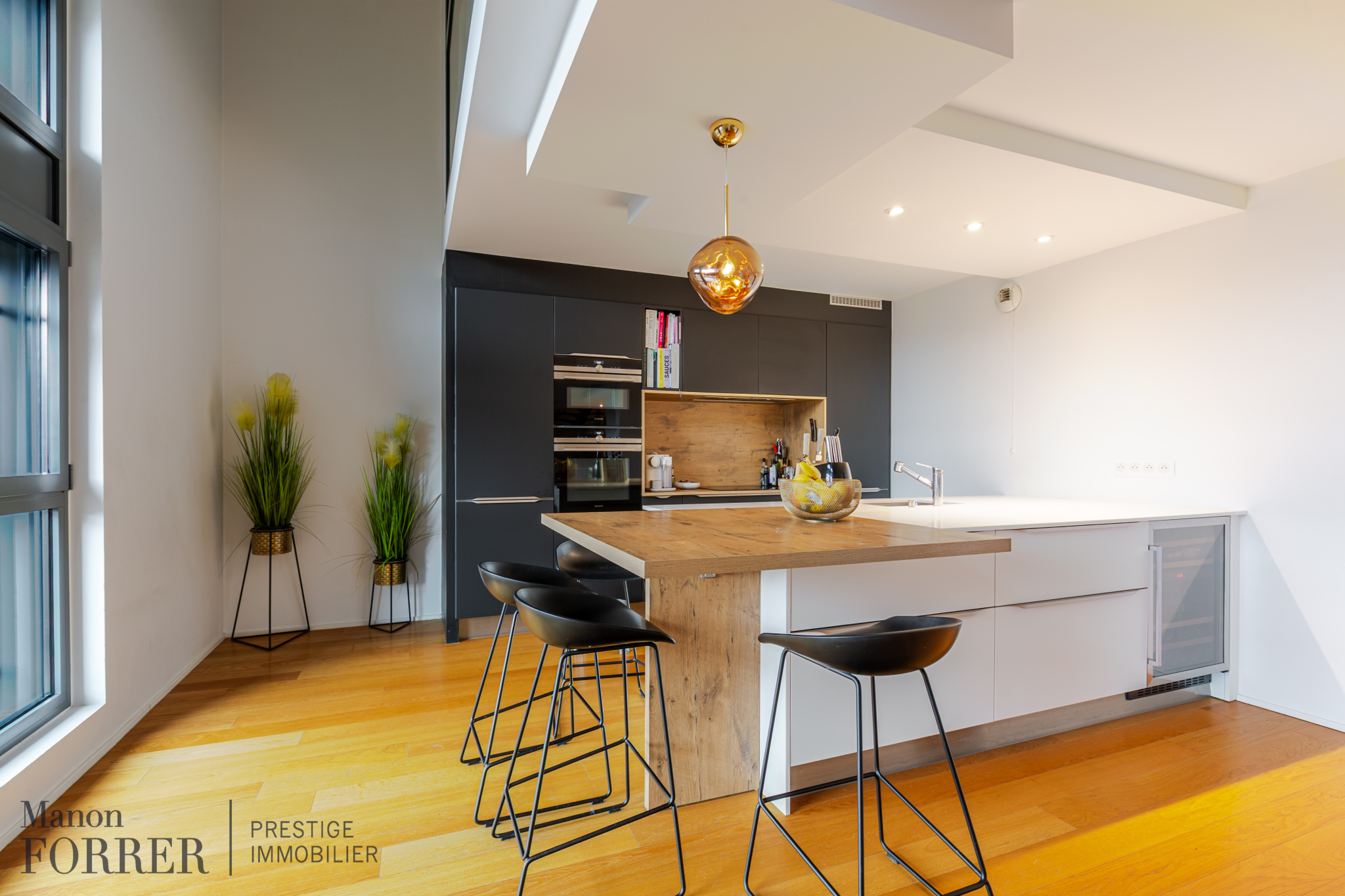 Ce bien d’environ 155m2 offrant de belles prestations se compose comme suit, au premier niveau une lumineuse pièce de vie comprenant un double séjour avec parquet, un espace salle à manger, une cuisine américaine entièrement équipée et avec îlot central, et un WC invites avec lave-mains.